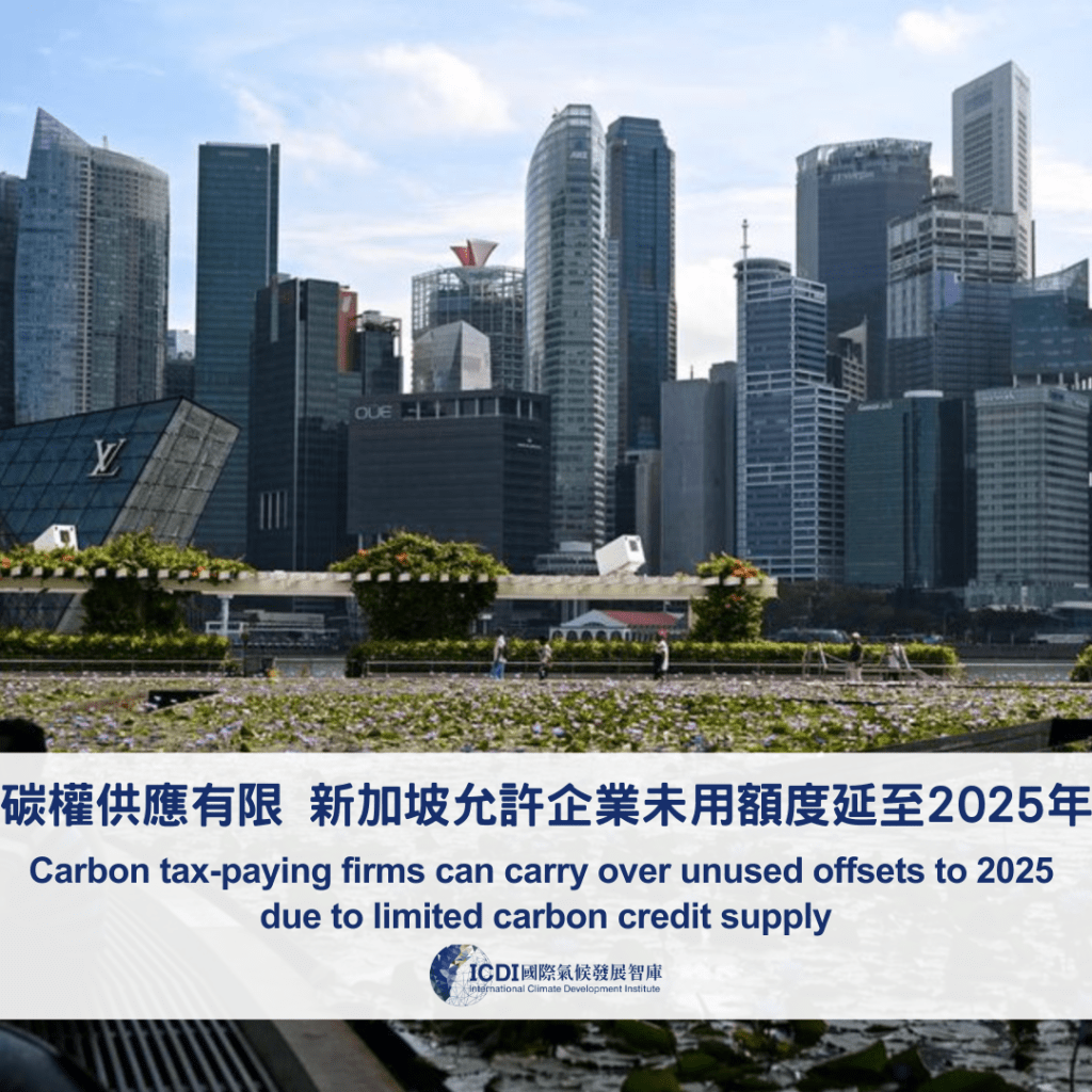 新加坡規範需要繳交碳稅 的企業,每年可使用符合資格的碳權抵銷最多5%的排放量。國家環境局宣布,因應2024年排放年度國際碳權供應有限,企業若在2024年未使用該抵銷額度,將可以轉移到2025年使用。表示企業在2024年未使用任何碳權,2025年可抵銷最多10%的排放量。