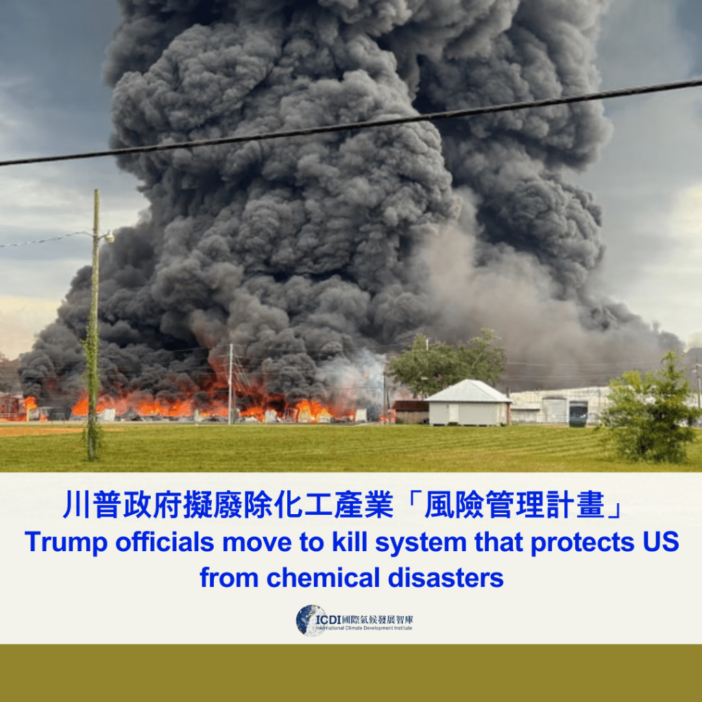 美國環境保護署(EPA)的「風險管理計畫」(Response Management Program, RMP)規範,要求超過12,500家高風險設施制定預防災難或限制事故後果的作業規範,以保護工人、第一線應變人員以及工廠周邊社區居民。拜登政府時期大幅強化相關保護措施。然而2025年在川普上任後,化工產業以「實施成本過高」,要求環保署撤銷規則,