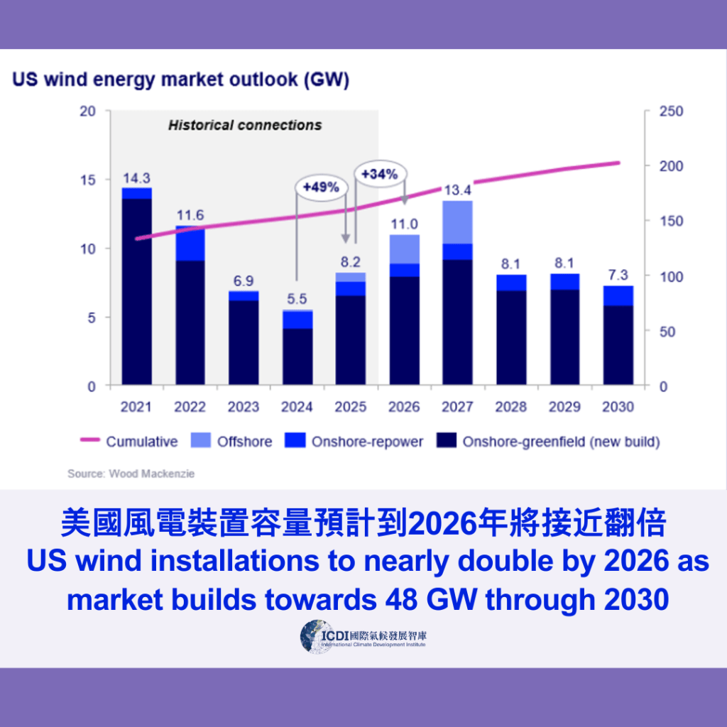 根據能源顧問公司Wood Mackenzie發布的《美國風能市場監測報告》,美國風電產業在2025年強勁反彈,新增裝置容量達8.2GW,年增49%,並預計2026年將達到約11GW。
